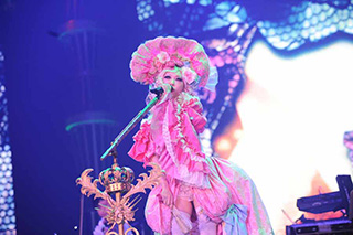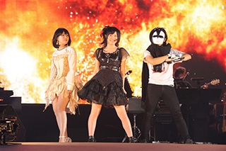 不穏なBGMを引き継ぎ、そのままステージにはALI PROJECTが現れる。ステージ上の燈台に火が灯り、「禁じられた遊び」が歌われる。ソファーに横たわりながらの歌唱は、まるで中世の王女のよう。そのまま続いた「聖少女領域」では、バックモニターの門から飛び出す赤いラインの演出と真っ赤なサイリュームの海とがバッチリハマり、アリプロの音楽を「体感」するのには実にふさわしい場となった。フェスでさえも会場をホームに作りかえてしまう、圧倒的な力。ムチを振り回しながら花道を悠々と行進する姿を見て、そう感じざるを得なかった。MCでは、今回は放送中の「『ローゼン(メイデン)』祭り」であることを明言。さすれば続く曲は「私の薔薇を喰みなさい」だ。初の生披露となったこの曲でも、ここまで2曲で作り上げた世界をそのまま引き継ぎ、アリプロワールド全開であった。