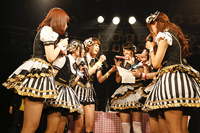 楽曲に関するトークでは、全員曲の「Starry Melody」の話題が。左右を見て隣の顔を見る振付の時、立ち位置が端で隣がいない桐谷は、渡部恵子とお互いが視界に入るように練習していたエピソードを語っていた。全体曲の歌割りについてのトークでは、レコーディングの時は全員が一曲を通して歌っているが、各アイドルの曲名を織り込んだような歌詞ではここを担当するかもと教えてもらったりする、といったことが語られていた。