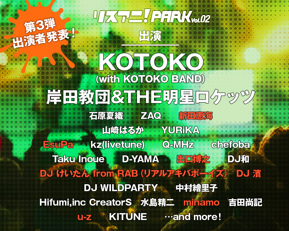 EsuPa/kz(livetune)/Q-MHz(出演:畑 亜貴・田代智一・田淵智也)/chefoba/Taku Inoue/D-YAMA/出口博之/DJ和/DJけいたん from RAB(リアルアキバボーイズ)/DJ 濱/DJ WILDPARTY/中村繪里子/Hifumi,inc CreatorS/水島精二/minamo/吉田尚記
