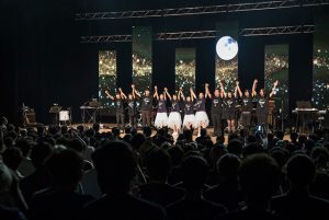 開演時間になるとsora tob sakana band setによるオープニング演奏がスタート。待ちわびたファンからの拍手が鳴り止まないなか、緞帳が左右に大きく開くとステージ上に長さの異なる7本のLEDがステージ上に姿を現し、その背後からsora tob sakanaの4人(風間玲マライカ、神﨑風花、寺口夏花、山崎愛)が登場。
