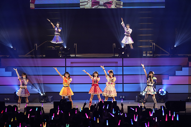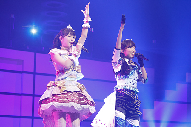 まずOPムービーでは、フィッティングルームのシーンが上映されるとライブロゴが登場。それに続き、これまでの名場面と合わせて出演者が紹介されると、松永あかね(友希あいね役)、木戸衣吹(湊みお役)、美山加恋(蝶乃舞花役)、二ノ宮ゆい(日向エマ役)、陶山恵実里(白百合さくや役)、桑原由気(白百合かぐや役)、逢来りん(春風わかば役)の7人がステージに登場。「アイカツフレンズ!」の1st OP「ありがと⇄大丈夫」を披露する。元々この曲は、あいね・みおのフレンズ(=作中の2人組ユニットの総称)“ピュアパレット”がOPで歌唱していた楽曲。松永が愛嬌ある歌声を響かせれば、Dメロではソロ中に木戸と視線を交わす。さらに落ちサビも、松永のソロに木戸が加わってのユニゾンへと続くパート割が、いきなり心をとらえる。入れ替わりに、ステージには田所あずさ(神城カレン役)と大橋彩香(明日香ミライ役)の“ラブミーティア”が登場し、1st ED「Believe it」を歌唱。スローでデジタルなR&B調の曲にのせ、Aメロからしとやかな佇まいで田所がステージに立ち、その田所のソロ中には大橋が跳ねたりと、各々アイドルの個性を活かしたパフォーマンスを展開。それでいて2サビではふたり向き合ったりと、歌詞のとおりラブミーティアらしく“同じ呼吸・同じリズム”で魅せていった。