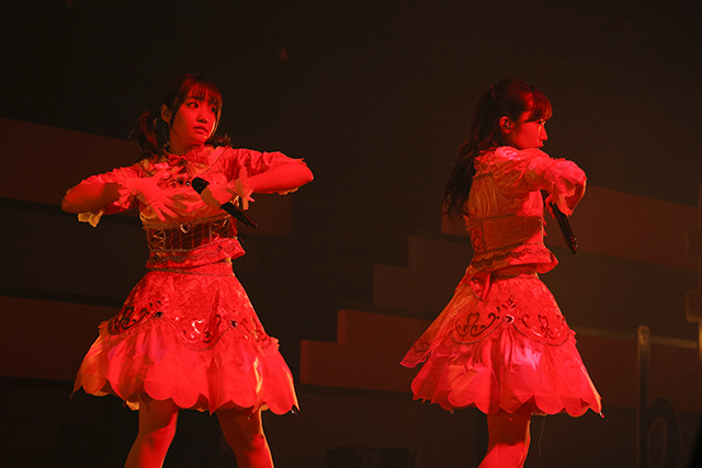 そして階段上ステージにリフレクトムーンが登場しての「Have a dream」では、互いの身体も活用してのコンビネーションの深まりをみせる。先ほどの対称ぶりに加え、サビではふたりのダンスが揃う部分もあるところフレンズとしての深化を表しているよう。2サビ明け、桑原がマイクを向けて客先を煽り、そのうしろで陶山がずっと凛としているのもこのふたりらしい。