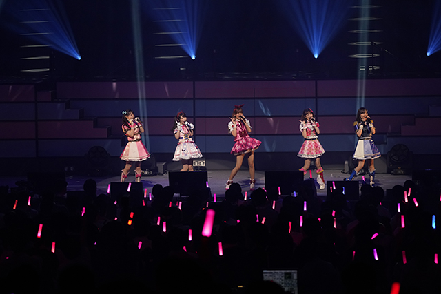 その余韻冷めやらぬなか、場内には『アイカツ!』でおなじみのフィッティングルームのBGM「芸能人はカードが命」が流れ、ステージをライトが照らすと『アイカツ!』で星宮いちごの歌唱を担当したわかと『アイカツスターズ!』で虹野ゆめの歌唱を担当したせなが衣装を身にまといステージに登場! さらに松永・木戸と、先ほどまでとは異なる衣装に身を包んだ逢来がステージに立ち、5人で「アイドル活動!オンパレード!ver.」を初披露。7年間のシリーズアンセムがまた新しい形で生まれ変わった感慨深さを感じる一方で、この顔ぶれのなかで、松永がキラキラ笑顔で堂々とソロを執っている姿には、改めて胸を熱くさせられる。2サビでの5人横一列になっての揃えた振付での披露に受け継がれる伝統を、完成の大きさにシリーズ全体の愛されぶりをそれぞれ感じさせられながら、驚きの1曲は歌われていった。