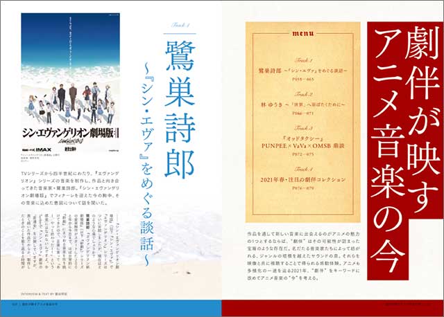 そして、劇伴特集“劇伴が映すアニメ音楽の今”として、鷺巣詩郎に『シン・エヴァンゲリオン劇場版』の劇伴制作にまつわる話を聞いたほか、『僕のヒーローアカデミア』『バクテン!!』など多くの作品の音楽を手がける林 ゆうきへのインタビューや、現在放送中の『オッドタクシー』で音楽を担当するPUNPEE、VaVa、OMSBの鼎談などを掲載。