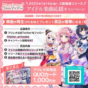 『Princess Letter(s)! フロムアイドル』公式Twitterをフォローし、キャンペーンTweetをリツイートすると、オリジナルQUOカード(1,000円分/非売品)の他、声優サイン入りアイテム等の賞品が抽選で当たる。賞品は、1月14日(金)22:00より3週にわたり公開される「アイドル楽曲MVの再生回数」が増えるほど豪華になるキャンペーン。