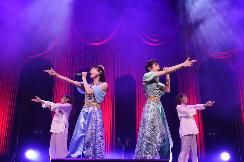 4人の息の合ったダンスパフォーマンスで楽曲の世界へ浸らせた「Jasmine」。特に〈好奇心のままに 外の世界に 触れてみたいの〉という部分で、曲の主人公の気持ちに寄り添い、感情を込めて歌っていたのが印象的だった。そして表題曲の「アラビアン・ユートピアン」を歌っていく。ダンスや歌声はもちろんだが、赤と黄色のライティングやレーザーを使った演出もアラビアンな夜を感じさせてくれる。クラップもあり、ファンと一緒に盛り上がった楽曲を歌い踊り切ったharmoeには、大きな拍手が送られる。だが、ライブはこの曲では終わらなかった。