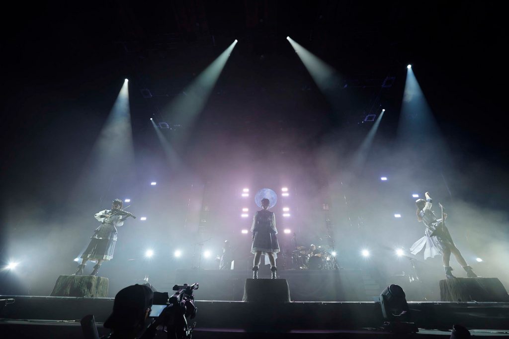 2曲目の「金色へのプレリュード」では客席が金色に染まり、美しい世界を見せてくれるも、自分を見失った“少女”はまだ不安に包まれたまま。そんな朗読とリンクした「月光花」「深海少女」のカバーは、切り株に1人腰掛け歌う進藤の姿がひたすら孤独で、その力強い歌声はもがき苦しむ“少女”の心の叫びのようにも聞こえる。3曲目に「月光花」、4曲目に「深海少女」という流れは1st Liveを彷彿とさせるものだが、朗読を交えた演出によって公演ごとにまったく異なる印象がもたらされるというのも、モニカのライブの楽しさの1つだ。