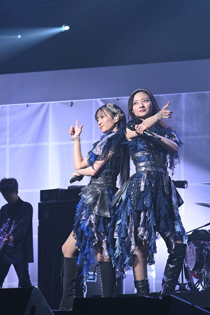 そして2番手として登場したのはfripSide。上杉真央、阿部寿世をボーカルに迎えた第3期ことfripSide Phase3としては初の“リスアニ!LIVE”出演となる。彼女たちの第1弾シングルとなったTVアニメ『魔法使い黎明期』のOPテーマ「dawn of infinity」でライブをスタートさせると、「リスアニ!Vol.47.2 fripSide音楽大全」付属のCDに収録された「when chance strikes -version 2022-」、Phase3の初オリジナルアルバムの表題曲「infinite Resonance」と続けて、ツインボーカルならではの新しいfripSideの世界を武道館に展開する。ラストスパートはシスターズダンサーをステージに迎え入れ、『とある科学の超電磁砲』関連曲のPhase3版となる「LEVEL5-judgelight- -version 2022-」「sister’s noise -version 2022-」で会場を熱く盛り上げて、ライブを締め括った。