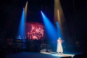 ダンサーとバンドによるインストパートを挟んだあとは、ライブも後半戦。昨日のこの場所では「一才は物語」で大きなインパクトを残したが、この日はひぐらしと鈴のSEから「藪の中のジンテーゼ」が始まり、こちらもまた趣向の異なるステージとなった。和風の映像をバックに、まるで南條とダンサーが影絵のようにシルエットが映し出される。そのなかでミステリアスなムードで雰囲気たっぷりの南條の歌唱が美しく艶やかに響いていく。そして曲が終わって暗転したあと、モニターには紫色のライティングと、優しいコーラスが響きわたる。『ジャーニーズ・トランク』収録の「Lonely voyage」がここで披露された。南條はステージ後方から微動だにせず、しかし時折感情が昂ったかのように強く声を張り上げる。その溢れんばかりの想いは最後、“また一緒に歌おう”という、本当に聴こえるか聴こえないかくらいのひっそりとした声に集約されていく。胸に手を当てるその姿からは、確かな想いが見てとれた。MCでも「……どうしても思い出しちゃうね」と語る南條。これまで数々の出会いや別れもあった、そうした10年史の別の側面を伺うことができたなかで、「色んなことがすべて含めて、大切な思い出がある10年だったなと改めて思いました」と語る。改めて想いを語る南條の姿がとても印象に残った。