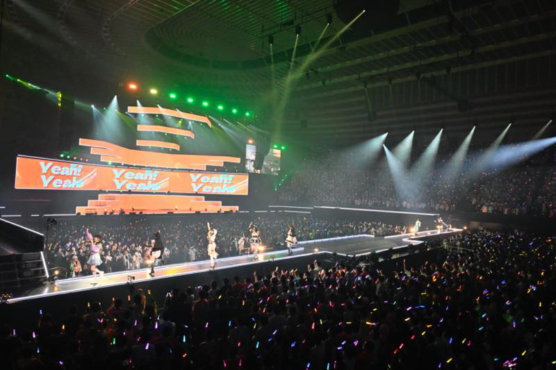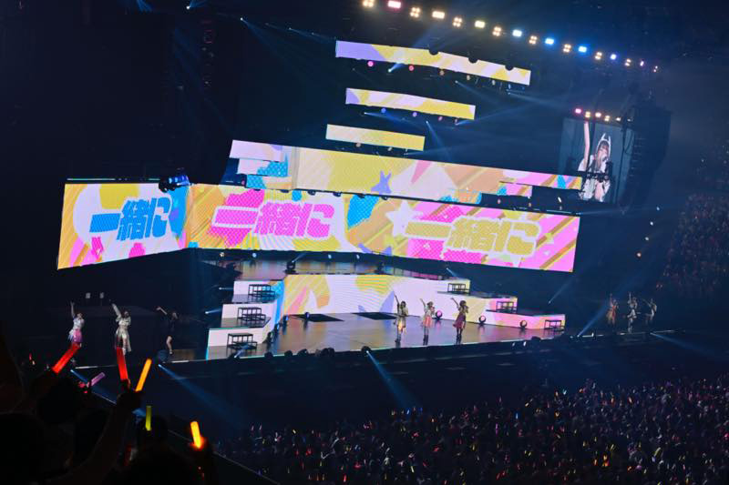 イルミネーションスターズより関根瞳と峯田茉優は、「スマイルシンフォニア」を披露した。呼吸を合わせてすぅっと息を吸った気配と共に、歌い出しのアカペラの美しい響きあいが空間を満たしていく。黄色、ピンク、青のライトと3つのスポットがステージを鮮やかに照らし出した。峯田が「みんな、一緒に歌ってー!」と力強く呼びかけると、冒頭から会場は大合唱。早くもクライマックスのテンションだ。3つの歌声が響きあい、絡み合って美しいハーモニーを奏でていく。スクリーンでは黄金に輝く音符たちが五線譜を流れて交響曲となる。落ちサビでは峯田の力強い歌声がもっともっと輝けると訴えているようだった。ラストは再び、城ホール全員での大合唱が高らかに響き渡った。