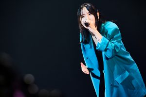 魅力的な女性アーティストが続いたワンマンステージを、エレガントに色づけたのはChouCho。『氷菓』OPテーマの「優しさの理由」では、透明感溢れるボーカルをどこまでも伸びやかに響かせ、「優しさの理由」と共に「私にとって大切な曲です」と言って歌い始めたのは『ガールズ&パンツァー 最終章』のオープニングを飾った「Never Say Goodbye」。客席には緑のペンライトが輝き、会場の空気がChouCho色に染められた。