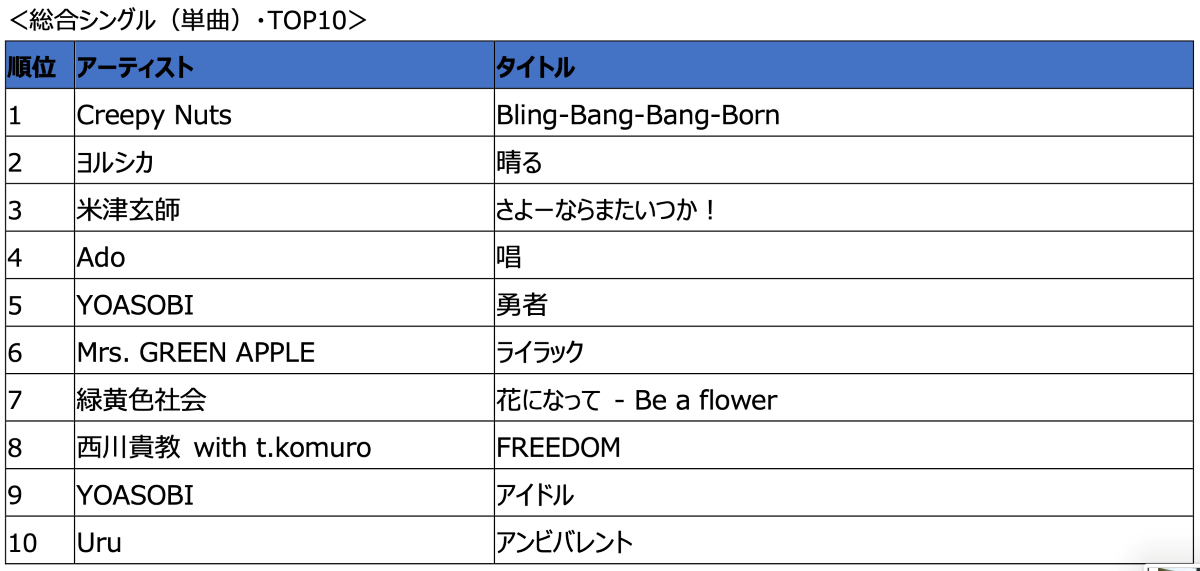 ●今年最もダウンロードされた楽曲はTVアニメ『マッシュル-MASHLE- 神覚者候補選抜試験編』OPテーマのCreepy Nuts「Bling-Bang-Bang-Born」。リズミカルなビートと中毒性の高いサウンドで今年一大ブームを巻き起こしました。