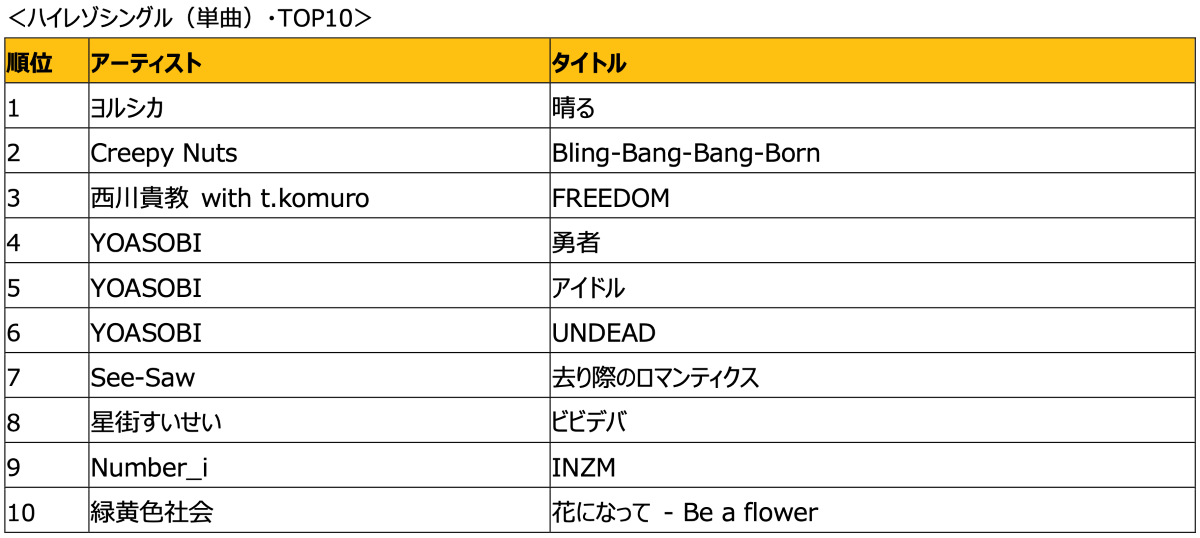 総合シングル(単曲)部門の2位にはTVアニメ「葬送のフリーレン」第2クールオープニングテーマのヨルシカ「晴る」。3位にはNHK連続テレビ小説「虎に翼」主題歌の米津玄師「さよーならまたいつか!」がランクインする結果となりました。