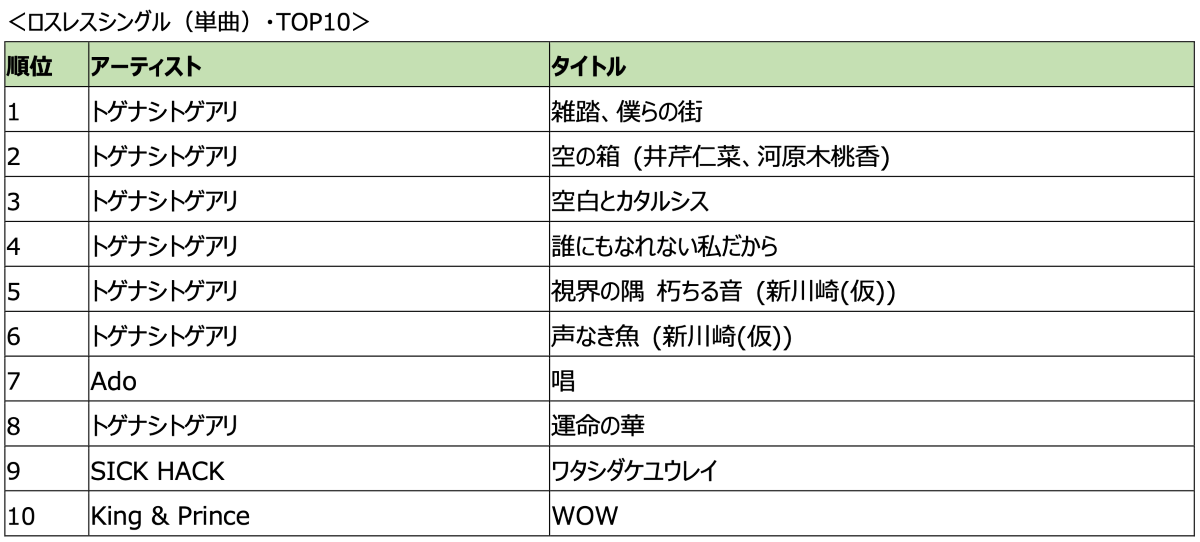 ●ロスレスシングル(単曲)部門では、その斬新なアプローチと唯一無二の表現力で、今年の音楽シーンで注目を浴びたトゲナシトゲアリが上位を席巻。1~6位まで独占し、ロスレスユーザーの心を掴みました。
