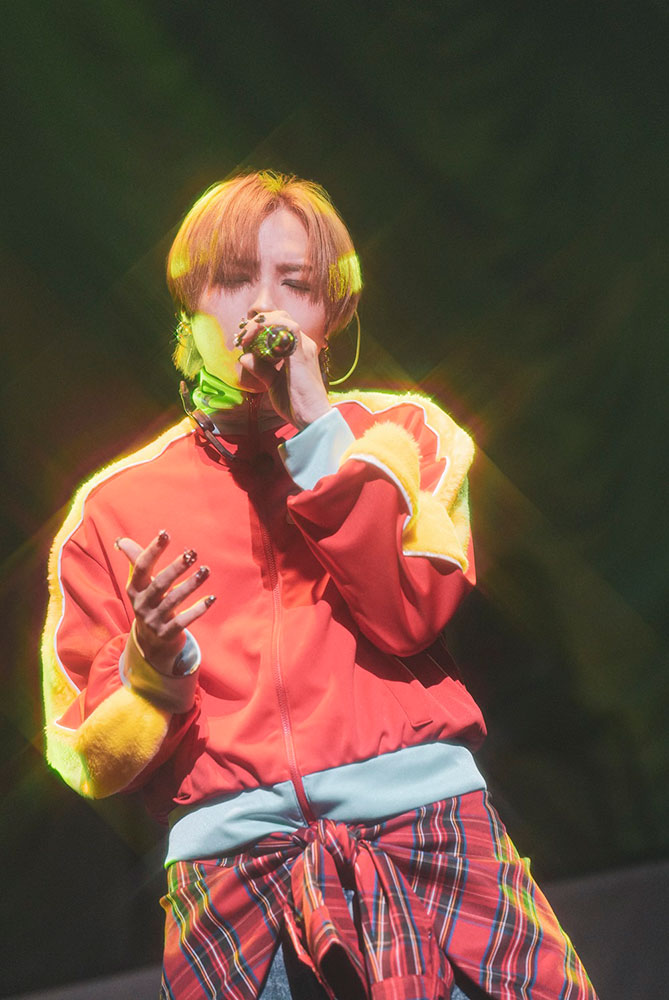 蒼井が言ったかっこいい天使。それを体現するような次の曲は「Let’s Go!」と低いシャウトで始まったハードでクールなロックナンバー「Freestyle Lover」!それまで青い色に染まっていた客席に、真っ赤なペンライトが交じり、蒼井は頭を振り、マイクを向けてオーディエンスを煽り、ステージにしゃがみ込んで熱を迸らせる。クールな天使のパフォーマンスは、ダンサーズが再び登場して「皆さんの笑顔をもっともっと見せてください!」と蒼井が告げた「SMILE SMILE SMILE」でまた熱を上げる。華やかなEDMサウンドにのせて手と腰を振りながら、キレのいいダンスをアンサンブルで魅せる。アウトロでは美しいロングトーンを響かせ、颯爽とステージを後にした。
