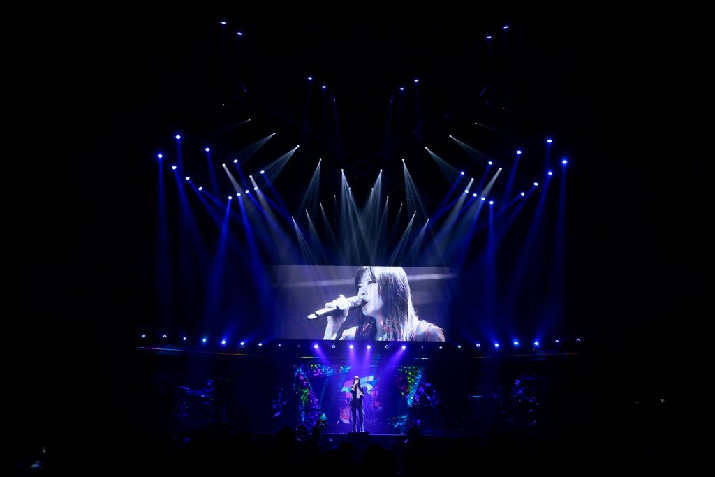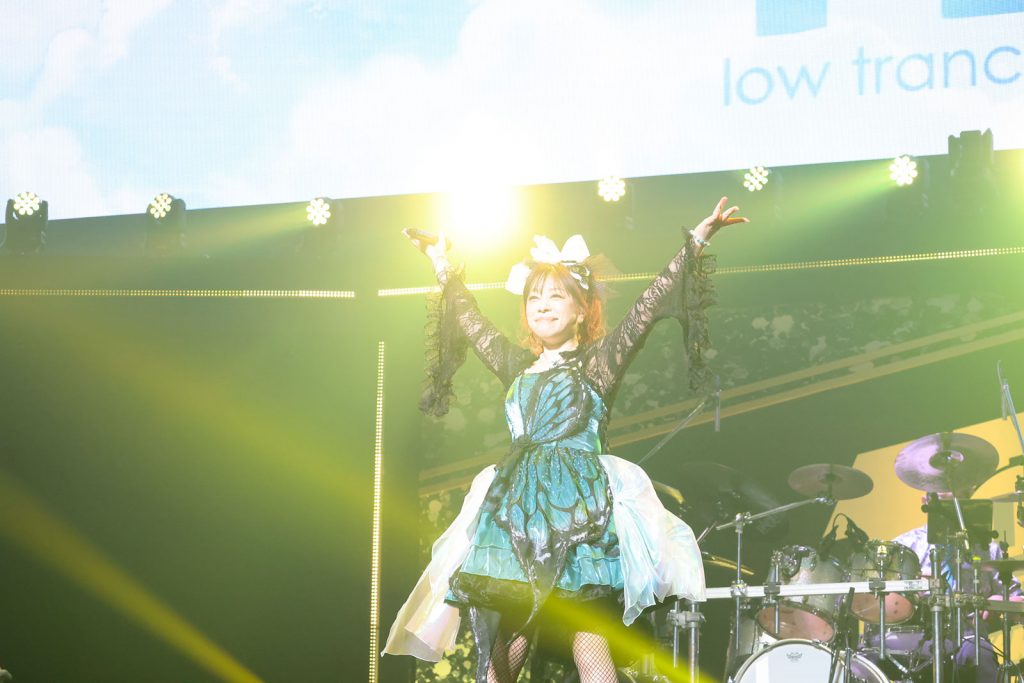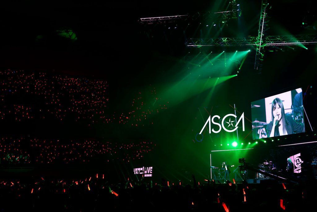 halcaからのバトンを受け取って次に登場したのは、彼女と同じくSACRA MUSICに所属するASCA。彼女もまた今回が6度目の“リスアニ!LIVE”出演となる。パンツルックにジャケットを合わせたシンプルな衣装で颯爽とステージに姿を現した彼女は、最新シングル「明日世界が終わるとしても」(TVアニメ『魔王様、リトライ!R』OPテーマ)をパワフルに届けて会場のテンションを一気に引き上げる。MCで“リスアニ!LIVE”は「私にとって原点のような場所」と語った彼女は、続いて梶浦由記が提供した「雲雀」(TVアニメ『ロード・エルメロイII世の事件簿 -魔眼蒐集列車 Grace note-』EDテーマ)を披露。スクリーンには羽毛が降り注ぐようなイメージ映像が投影されて歌詞の世界観とシンクロした景色が作り上げられるなか、ASCAは郷愁を誘う儚い歌声を天高く羽ばたかせていく。そして空気を切り裂くようなファルセットを皮切りに「FACELESS」(アニメ『ばいばい、アース』OPテーマ)へ。リスアニ!BANDの奏でるドラマチックなロックサウンドと共鳴しながら、楽曲が進行していくにつれて感情を爆発させるように歌う。続くMCで、自分自身の弱さと戦ってきたなかで今日まで歌ってこれたのは、こうして一緒にライブを作り上げてくれる観客を含めた今までのすべての出会いのおかげだと語り、「私のありったけの愛を捧げます」と告げて、自身も作詞で関わった「紫苑の花束を」(TVアニメ『魔法科高校の劣等生』第3シーズン「古都内乱編」EDテーマ)を歌唱。別れを受け止めながらも募る愛をしなやかな歌声であくまでも優美に表現すると、ワンコーラスまで披露したところで突如“叫び続けろ”と力強く歌い始めて「Howling」(TVアニメ『魔法科高校の劣等生 来訪者編』OPテーマ)にスイッチ。幾多のライブを盛り上げてきたアップナンバーの投下に客席のペンライトは一面オレンジに切り替わって燃え上がる。ASCAは歓びに満ちた表情で吠えるように歌い上げ、この日のライブを完走した。いつにも増して真っ直ぐ突き刺さってくるような歌声が、また一皮むけたことを感じさせる時間だった。