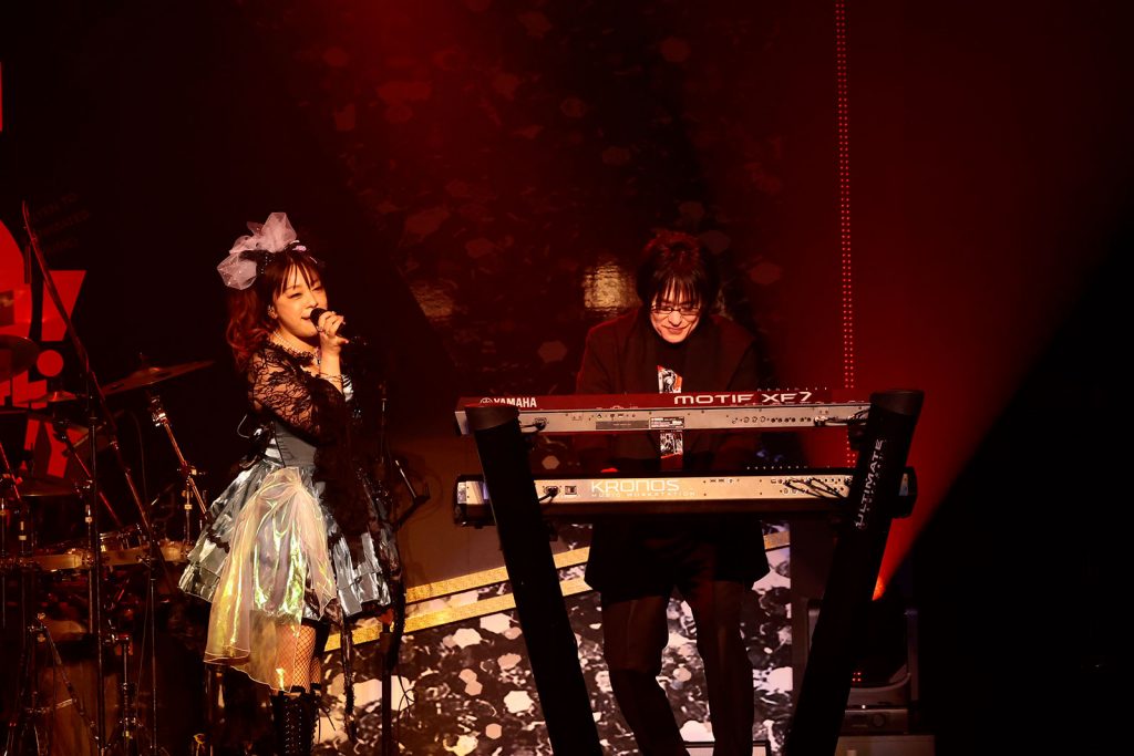 2番手には、メジャーデビュー20周年イヤーを迎えてますます盛んに活躍するKOTOKOが登場。“リスアニ!LIVE”には2023年以来、5回目の出演となる。“ラスボス”と称される程のキャリアと実力を持つ彼女は、2000年代アニメソングを代表する楽曲のひとつ「being」(TVアニメ『灼眼のシャナ』後期OPテーマ)からライブをスタート。イントロが奏でられた瞬間に会場からは大きな歓声が起こり、会場中が赤いペンライトで染まるなか、爽快さと切なさを併せ持った歌声が胸をギュッと締め付ける。そこから「七転八起☆至上主義!」(TVアニメ『ハヤテのごとく!』後期OPテーマ)に繋げ、当時を知るファンもそうでない人も声を上げて熱狂。そしてMCで、毎回様々なチャレンジをさせてくれる“リスアニ!LIVE”への想いを伝えると、この日だけの“リスアニ!LIVE × I’veメドレー”へ。I’veの高瀬一矢(Key.)をスペシャルゲストに迎え、スクリーンに大きく映されたI’veのロゴのもと、名曲の数々を展開していく。まずはI’ve印のぎらついたトランス×ロックサウンドが体と脳を揺らすMELL「Red fraction」(TVアニメ『BLACK LAGOON』OPテーマ)を放つと、川田まみ「No buts!」(TVアニメ『とある魔術の禁書目録II』前期OPテーマ)をエモーショナルに歌い上げてさらに加速。さらにKOTOKO自身が歌詞を提供したRay「sign」(TVアニメ『あの夏で待ってる』OPテーマ)で夏色の景色を描き出すと、I’veとKOTOKOの歴史を語るうえで欠かせないPCゲームソングから2002年の楽曲「Wing my Way」(PCゲーム「ファーランドシンフォニー」OPテーマ)を伸びやかに歌唱。そして黒崎真音「X-encounter」(TVアニメ『東京レイヴンズ』OPテーマ)を勇ましく届けると、KOTOKOが個人で担当した初めてのアニメ主題歌「Re-sublimity」(TVアニメ『神無月の巫女』OPテーマ)で鮮烈なハイトーンを聴かせてフィニッシュ。2005年に開催されたI’veとしての初の日本武道館公演からちょうど20年の時を経て、その興奮を同じ会場にて蘇らせた。