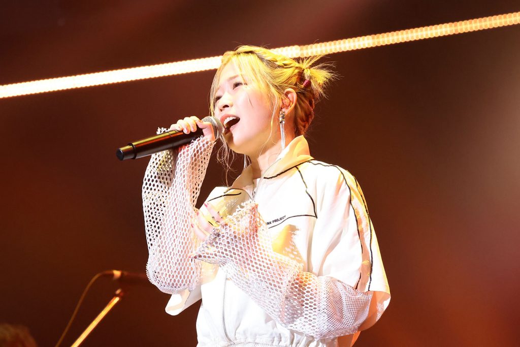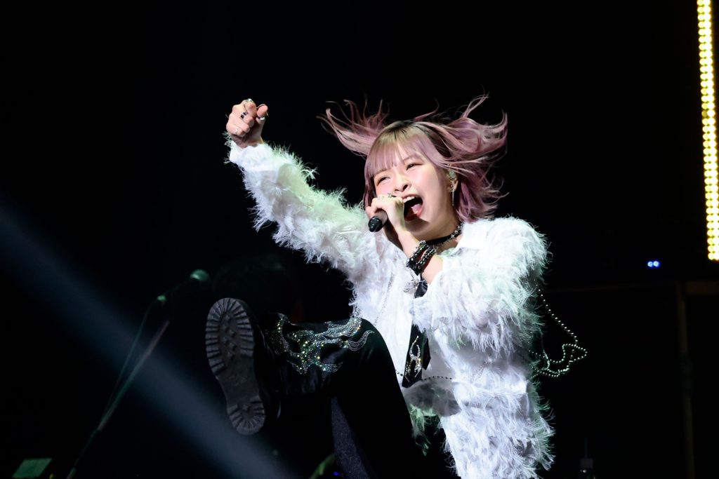 続いては、甘さとハスキーさを併せ持った歌声でアニメ音楽のシーンを中心に活躍する、「小文字で5文字」でお馴染みのhalcaが登場。“リスアニ!LIVE”には6回目の出演、もはや常連組と言っても過言ではない彼女は、前山田健一が作詞・作曲した「告白バンジージャンプ」(TVアニメ『彼女、お借りします』EDテーマ)を飛び跳ねたりエアギターを交えたりしながら、とびっきりの笑顔と共に届けて、武道館中に陽性のエネルギーを行き渡らす。そこから間髪入れず田淵智也(UNISON SQUARE GARDEN)提供の「誰彼スクランブル」(TVアニメ『Engage Kiss』OPテーマ)を披露。リスアニ!BANDによるパンキッシュ&エネルギッシュな演奏と、それに負けないどころか豪快に乗りこなしながら、ステージを駆け巡ってキャッチーな歌声を振り撒く彼女の成長と進化ぶりが凄まじい。MCでも天真爛漫で元気いっぱいな一面を見せつつ、グッズタオルを手にして「武道館を風いっぱいにしよう!」と呼び掛けて、彼女の現時点での最新シングルとなるパワフルなガールズロックチューン「瞬間最大風速」(TVアニメ『魔法使いになれなかった女の子の話』EDテーマ)を披露。オーディエンスもタオルをブンブン振り回して風を巻き起こす。ラストは2019年の初出演以来、“リスアニ!LIVE”のステージでも何度となく歌ってきた彼女の代表曲「センチメンタルクライシス」(TVアニメ『かぐや様は告らせたい~天才たちの恋愛頭脳戦~』EDテーマ)。デビュー時からの彼女の持ち味であるピュアで甘酸っぱい部分はそのままに、感情の込め方や細かなニュアンスの付け方などあらゆる面においてスケールアップしたパフォーマンスでライブを結んだ。