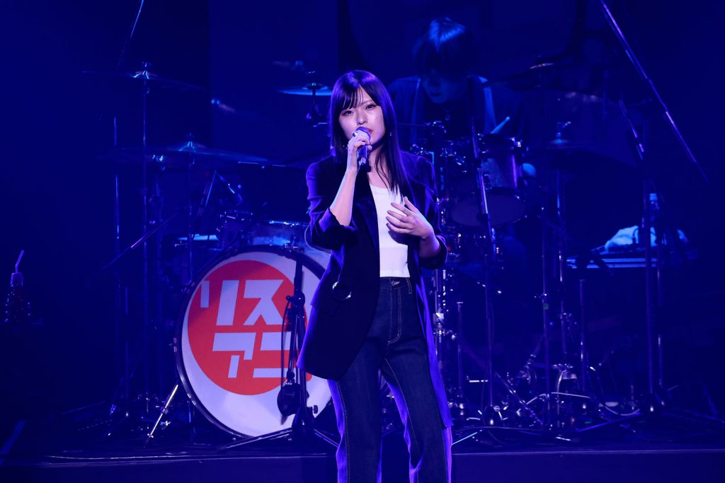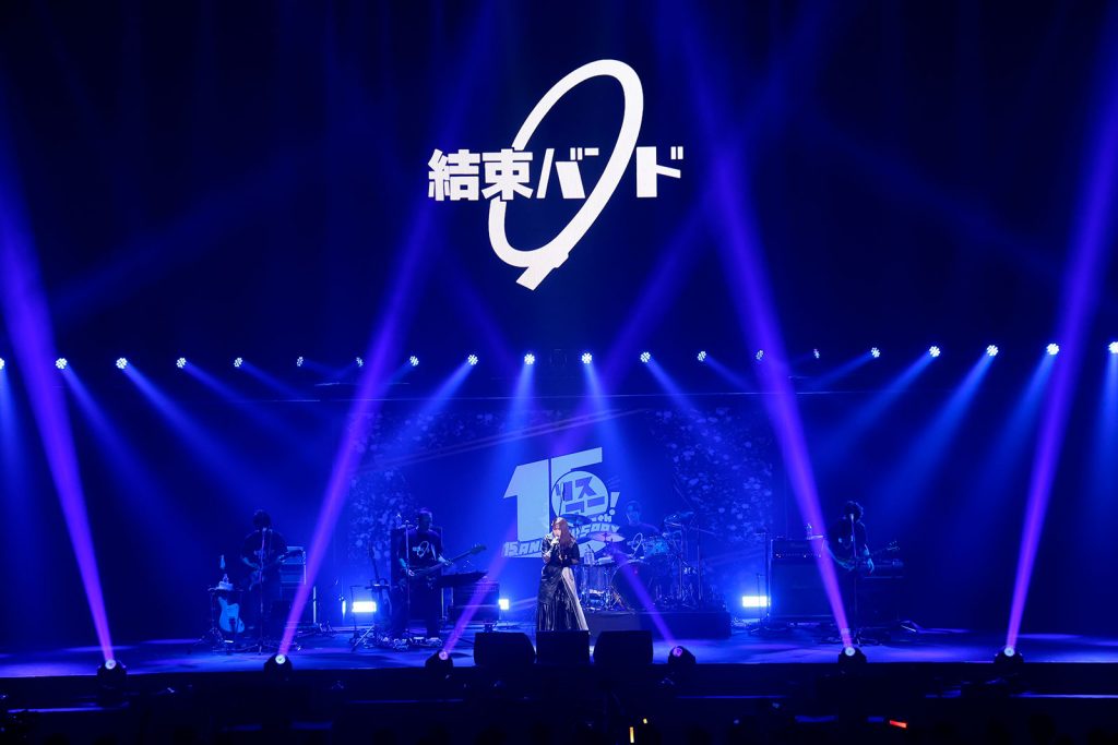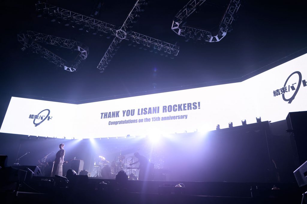 終盤戦をロックに盛り上げたのが、TVアニメ『ぼっち・ざ・ろっく!』の大ブレイクをきっかけに、いまや数々のロックフェスに出演するほどの人気を獲得するまでになった結束バンド。“リスアニ!LIVE”には初登場、しかもいわゆるアニメ系のライブイベントに出演するのも今回が初となる。まずは演奏メンバーの生本直毅(Gt)、akkin(Gt)、比田井 修(Dr)、ヤマサキヒデアキ(Ba)がステージに登場してスタンバイすると、TVアニメのOPテーマ「青春コンプレックス」のイントロが奏でられ会場の熱気は一気に沸点まで跳ね上がる。黒いレザージャケットを羽織った長谷川育美(喜多郁代役)がステージ中央に歩み出て、鋭さを纏った鮮烈なボーカルを叩きつける。歌い終えて喜多ちゃんの声音で「結束バンドです!」と挨拶すると、そのまま一気に「ギターと孤独と蒼い惑星」へと雪崩れ込み、青春の疼きを感じさせるボーカルと焦燥感溢れるバンドの演奏のダブルパンチで会場を熱狂の渦に巻き込んでいく。特に後半、長谷川の感情をぶちまけるような歌唱が観る者の心を震わせる。さらにノンストップで「あのバンド」に突入。「ギターと孤独と蒼い惑星」と「あのバンド」はTVアニメ第8話、STARRYでの初ライブのシーンで演奏された楽曲だが、これまでツアーを含め多数のステージを経験してきた長谷川のボーカルと歴戦のプレイヤーによる演奏が合わさった今の結束バンドは、ライブハウスどころか日本武道館でも足りないくらいのスケール感がある。怒涛の3曲を終えてにこやかに挨拶した長谷川は、次の楽曲では手を横に振るように呼び掛けて「星座になれたら」を歌唱。先ほどまでの鬼気迫る歌声から一転、キラキラした歌声が会場に降り注ぎ、サビでは誰もが手を挙げて横に振って、ペンライトが彗星のような光跡を描く。最後は長谷川に代わって青山吉能(後藤ひとり役)がステージに立ち、TVアニメ最終話のエンディングを飾ったASIAN KUNG-FU GENERATIONの楽曲のカバー「転がる岩、君に朝が降る」を披露。歌い始める前に「リスアニ!に愛と感謝を込めて、この歌を歌わせていただきます」と告げた彼女は、最初はハンドマイクを両手で握りしめながら必死な表情で、そして徐々に笑顔も時おり見せながら情感豊かに歌を届ける。歌唱し終えた青山の優しい微笑みと、最後にLEDスクリーンに映し出された「THANK YOU LISANI ROCKERS!」というメッセージが会場の空気を暖かにして、結束バンド初の武道館でのライブは幕を閉じた。