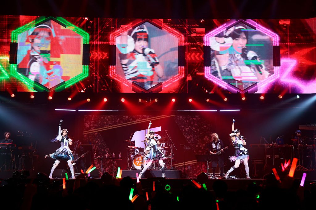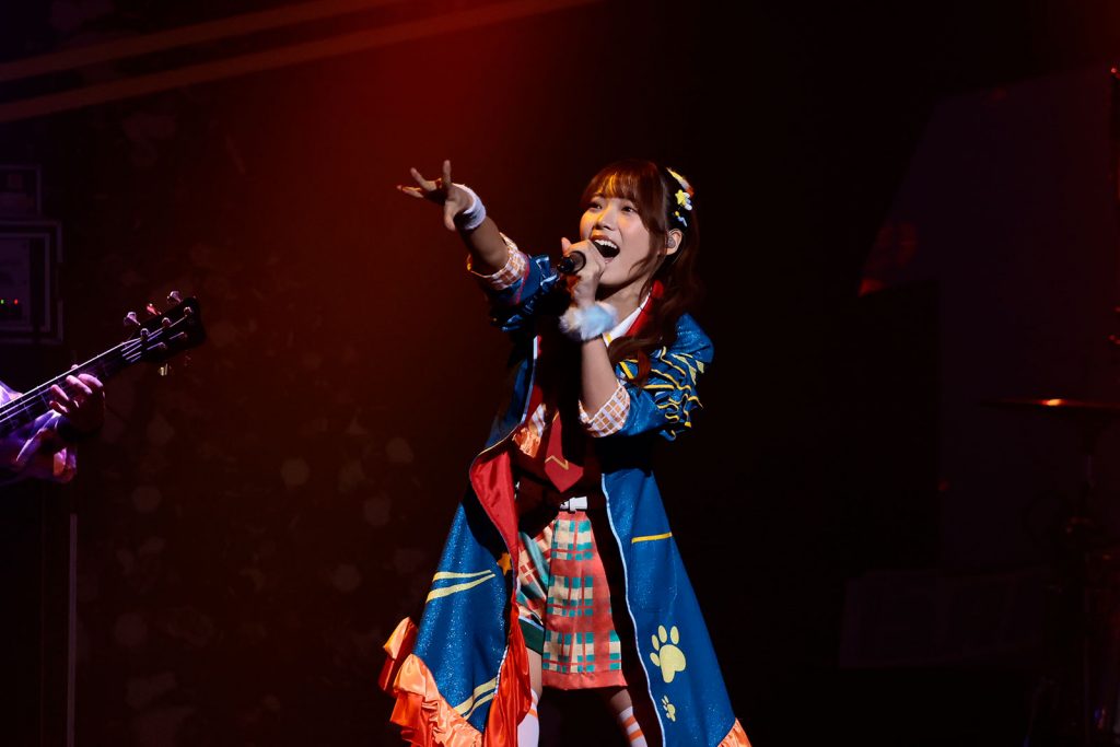 ここからは早くも後半戦に突入。「アイドルマスター シャイニーカラーズ」より、実在と非実在を行き来するカリスマ的アイドルユニット、ストレイライトが登場する。“リスアニ!LIVE”には3年連続3回目の出演となるなか、今回はアッパーなデジタルロックチューン「Imitation Ghost」でライブをスタート。田中有紀(芹沢あさひ役)、幸村恵理(黛 冬優子役)、北原沙弥香(和泉愛依役)が3人横並びで動きを合わせながら歌い踊る様に会場は瞬く間に熱狂し、間奏のヘドバンパートを経てのフォーメーションダンスなど見せ場もたっぷりだ。そして過去2回の“リスアニ!LIVE”出演時にも披露してきた「Timeless Shooting Star」へ。イントロのギターリフから一気に沸く客席を不敵に見渡しながら、スタイリッシュなダンスと共にそれぞれの輝きを持った歌声を届けていく。相当な運動量にも関わらずブレることのないボーカルワーク、自信満々の表情からは、あらゆる壁を乗り越えて高みを目指すアイドルユニットとしての貫禄がしっかりと伝わってくる。MCで3年連続の“リスアニ!LIVE”出演とイヤモニ越しからも伝わってくるほど大きな声援に対して喜びのコメントをそれぞれの述べた3人は、「この熱量を引き続き私たちに浴びせてください!」(田中)との言葉に続けて、アップテンポでダンサブルな楽曲が多い彼女たちのレパートリーの中では珍しいミディアムナンバー「LINKs」を披露。重みを感じさせるロッキンな生演奏に感情をたっぷり込めた3人の歌声、そして手を重ね合わせる振付や仲間との絆や繋がりを描いた歌詞がエモーショナルに響く。そして最後は彼女たちの原点と言うべき楽曲「Wandering Dream Chaser」。1サビ入り前のキメのフレーズ“諦めない、絶対”というセリフ部分もかっこよく決めてみせ、カリスマ的なパフォーマンスでシューティングスターのようにラストまで駆け抜けていった。