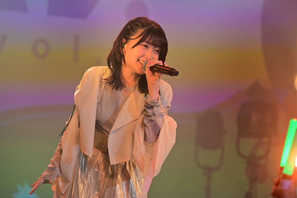 続いて登場したのは、「アイドルマスター シャイニーカラーズ」ストレイライトの芹沢あさひ役や、NOW ON AIR、Kleissisといった声優ユニットでの活動を経て、2024年にソロアーティストデビューした声優の田中有紀。登場早々「今日一番楽しんで帰ってください!」と呼び掛けると、1stアルバム『Crier』より力強いアップチューン「From here to HISTORIA」を披露し、アーティストとしての新しい一歩を踏み出した気概を熱い歌に込めて届ける。ギラギラしたシンセとギターサウンドが融合したダンスロック「Going Going Going」では重厚なグルーヴに乗りながら勇ましい一面を見せ、続く「Blue Wind」ではどこか懐かしくも心を奮い立たせるメロディと共に情熱の青い風を会場に吹き込む。MCではファンとやり取りしたり、初お披露目の衣装を楽しそうにアピールしたりとフレンドリーな雰囲気に。そんな彼女だからこそ、自身が作詞に関わったパワーバラード「Dear STELLA」での出会いの奇跡と感謝の気持ちを伝える言葉が余計に染みわたる。最後は自身の1stシングルとなるTVアニメ『Aランクパーティを離脱した俺は、元教え子たちと迷宮深部を目指す。』のED主題歌「Treasure Chest」を、アニメーション映像をバックにしながら優しく朗々と歌い上げてライブを締め括った。