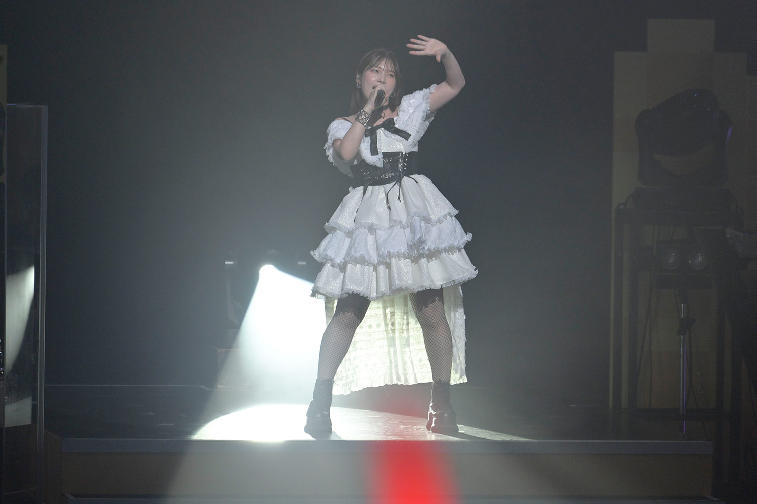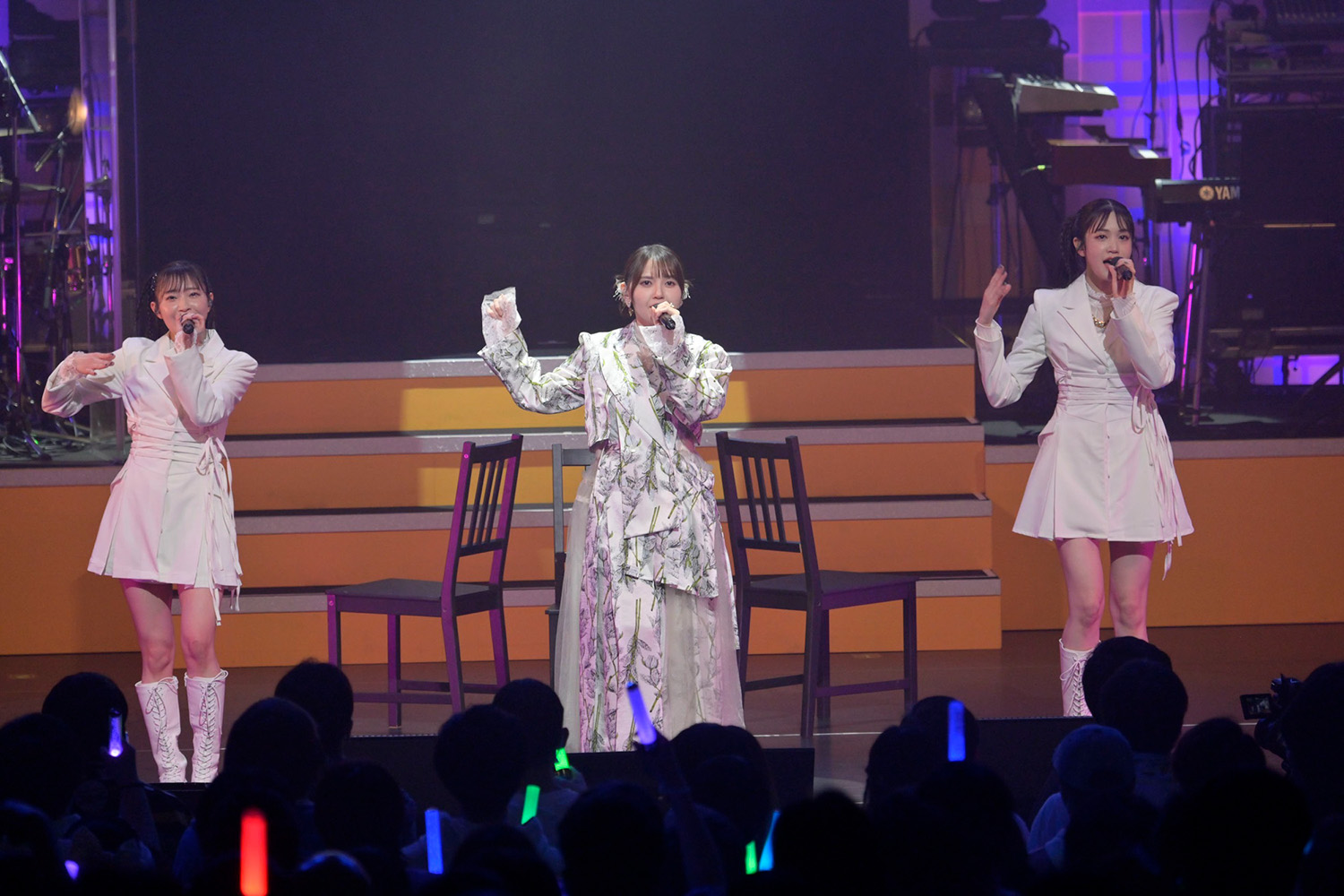 そしてそこに鬼頭が加わり、彼女の持ち歌「深夜センチメンタル」でこちらもサプライズコラボ!本楽曲定番となっている椅子を使ったダンスを3人で披露し、視覚面からもコラボレーションする。また落ちサビでは、岩田陽葵が上ハモ・小泉萌香が下ハモを担当。鬼頭の歌う主線を彩って、一夜限りのレアなパフォーマンスを見せてくれた。