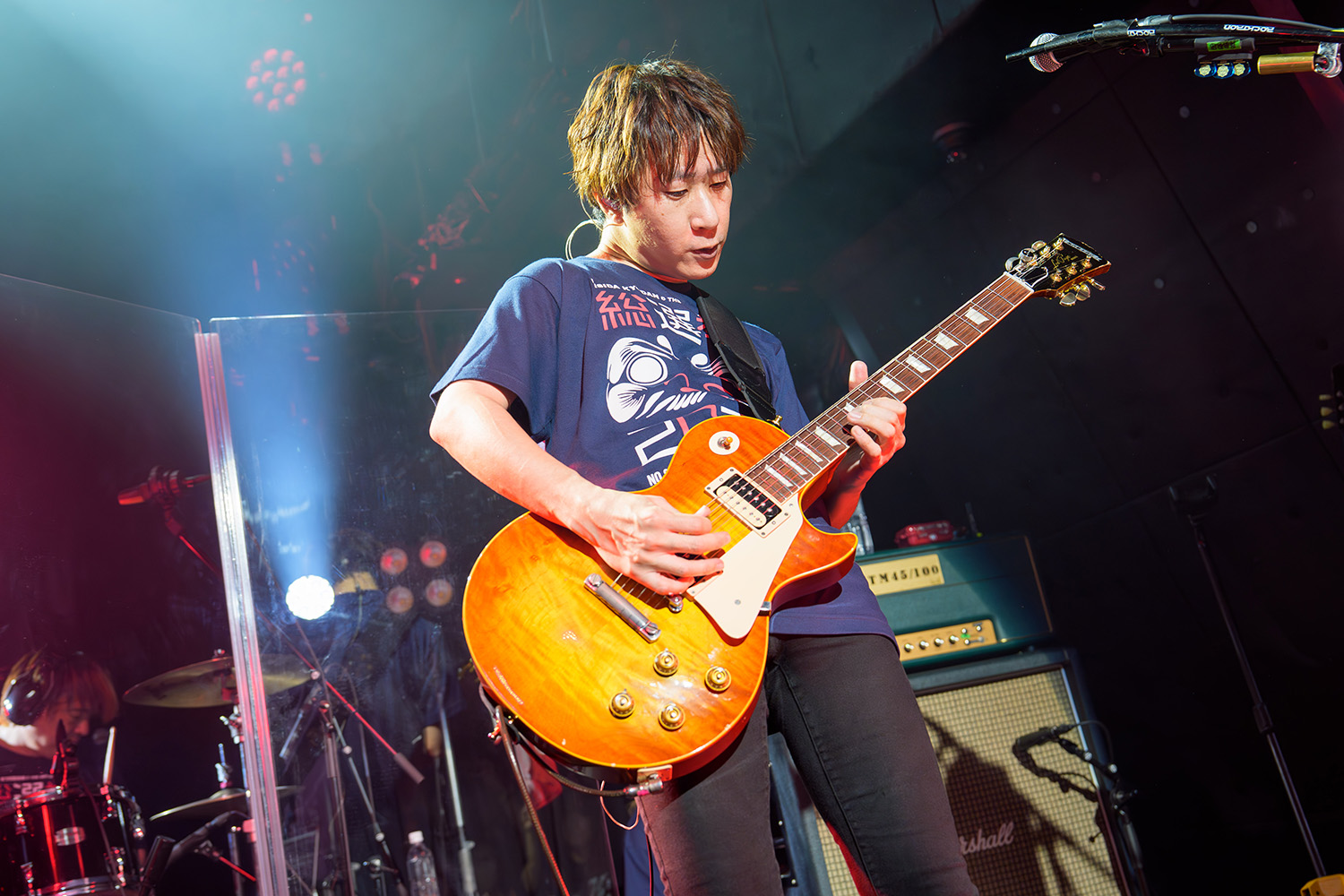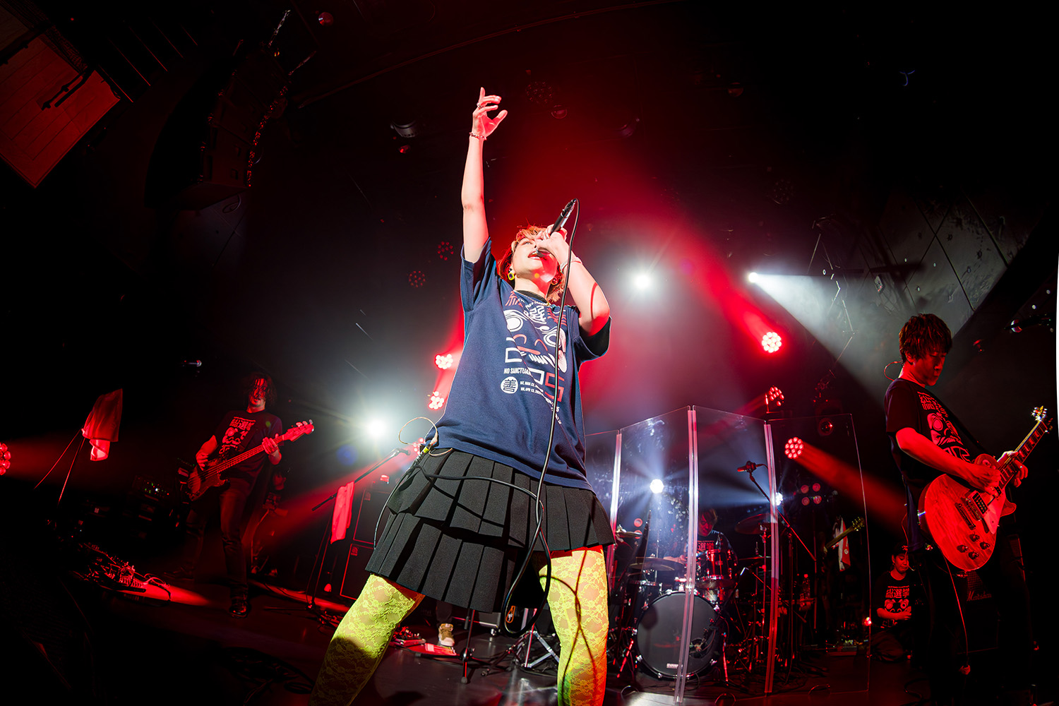 あまりの熱気に岸田も思わず「ちょっと休憩していいですか?」と言うほどの雰囲気のなか、ここからはクールダウンかと思わせて「ケモノノダンス」(総選挙4位)とこれまた人気かつフィジカルの強い楽曲へ。ichigoも観客もケモノポーズでフロアを右に左に大移動する。そこからみっちゃんの高速ドラムフィルから始まる「Rewriter」(総選挙15位)でより鋭利なサウンドを突き刺していく。そこからの「暁を映して」(総選挙14位)では、はやぴ〜のヒステリックなギターから始まり、ドラム、ベース、ボーカルというサウンドが一体となるものすごい爆発力を生んだ。これまで蓄積された熱気が一気にハレーションを起こすような光景は、これこそが岸田教団&THE明星ロケッツのライブだと感じさせる圧巻そのもの。そうしたアグレッシブなセットから続いては「11月」(総選挙20位)のしっとりとした導入へと繋がっていく。言うまでもなくここはichigoのボーカルの見せどころで、エモーショナルなその歌唱を存分に堪能することができた。