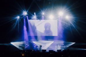 壮絶な戦いの先にあった、TVアニメ『東京喰種トーキョーグール:re』最後のシーンから時が巻き戻されていく。あの日のこと。あの瞬間の思い。金木 研の叫び、永近英良が漏らした本音、霧嶋菫香の激昂、亜門鋼太朗の慟哭……まるで現実の時間も戻されていくような感覚に陥る。静けさに包まれたステージに花澤香菜が現れ、物語の、「悲劇」の始まりを語り出す。まだ金木が人間だった頃。行きつけの喫茶店「あんていく」で自分の好きな作家・高槻 泉の小説を愛読する神代利世と出会った時のこと。金木役の花江夏樹も舞台に上がり、花澤が演じる利世と金木の“あの場面”、喰種としての姿を見せた利世に金木が襲われた場面を生アフレコで聞かせる。利世の狂気を孕む声と金木の恐怖が渾身の芝居で蘇ると、オーディエンスはシーンと息を飲むように静まり返り、ステージを見つめる。そこに重々しいギターの音。People In The BoxがTVアニメ『東京喰種トーキョーグール』EDテーマ「聖者たち」を響かせる。重く厚く轟く福井健太のベースの音に、鼓動のようにリズミカルに打たれる山口大吾のドラム。そして憂いを帯びながらも切々と歌い上げる波多野裕文の歌声と爪弾かれるギター。それら3つの旋律が物語の不穏さと金木たちの暮らす街の日常の景色を感じさせた。