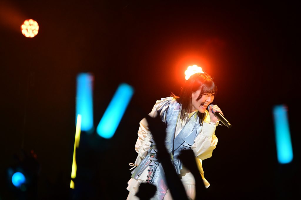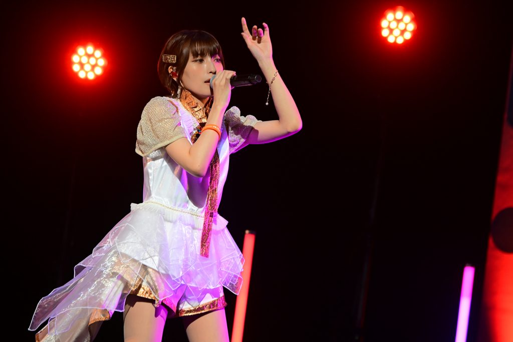 続いて登場したのは、“おとぎ話”をテーマにした楽曲で音楽と物語が融合した世界を表現する、岩田陽葵と小泉萌香による声優ユニット、harmoe。純白かつ煌びやかに光るお揃いの衣装を着た2人は、「トゥインクル・デイズ」(TVアニメ『いずれ最強の錬金術師?』ED主題歌)でライブをスタート。彼女たちのライブは、まるで双子のように溶け合う2声による色とりどりの歌唱表現のみならず、多彩な動きを取り入れたダンスパフォーマンスも込みでストーリーを作り出すのが最大の魅力。この日もヘッドセットマイクを装着し、大きな動きと共に楽曲を描いていく。続く「旅しよ!don’t you?」(TVアニメ『ざつ旅-That’s Journey-』OP主題歌)では、電車のような動きで“旅”を表現しつつ、ワクワクするような歌声でオーディエンスを未知のミュージックジャーニーへ誘導。更に、ここからはMCなしで1つの世界観を紡ぐ普段のワンマンライブの雰囲気を味わってほしいとのことで、4曲をノンストップで披露することに。ディスコフィーリングの「カラフル×ジョイフル」では、事前に披露を告知していたこともあり、予習していた観客のコールが大きなうねりを生み出し、EDM調の「金色イニシエィション」では躍動感溢れるビートに合わせて飛び跳ねるように歌う2人につれらて会場に笑顔の花が咲く。そこから一転、アップリフティングかつエキゾチックなサウンドが印象的な「アラビアン・ユートピアン」では、艶やかさも感じさせる動きと歌唱で魅了し、最後は岩田と小泉も作詞に参加したハイパーなベースミュージック「HyperLoveSong」でスタイリッシュ&アーティスティックに愛を表現して締め。細やかな動きを含めひと時も見逃せないステージだった。