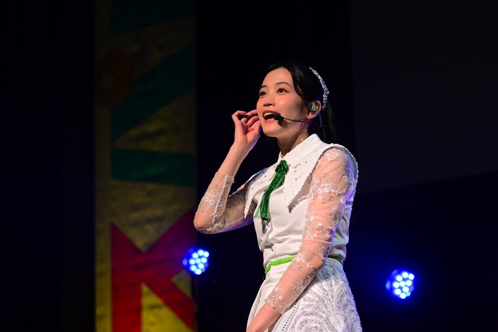 本公演の全体MCを担当したのは、「ハチパレ」のパーソナリティ・豊田穂乃花。オープニングトークでは「外は熱かったですよね。でも、もっと熱くなります!」と期待を煽り、幕間MCではリスアニ!編集長の馬嶋 亮と共にライブグッズを紹介。イベントの案内役として、楽しみどころを手引きする。