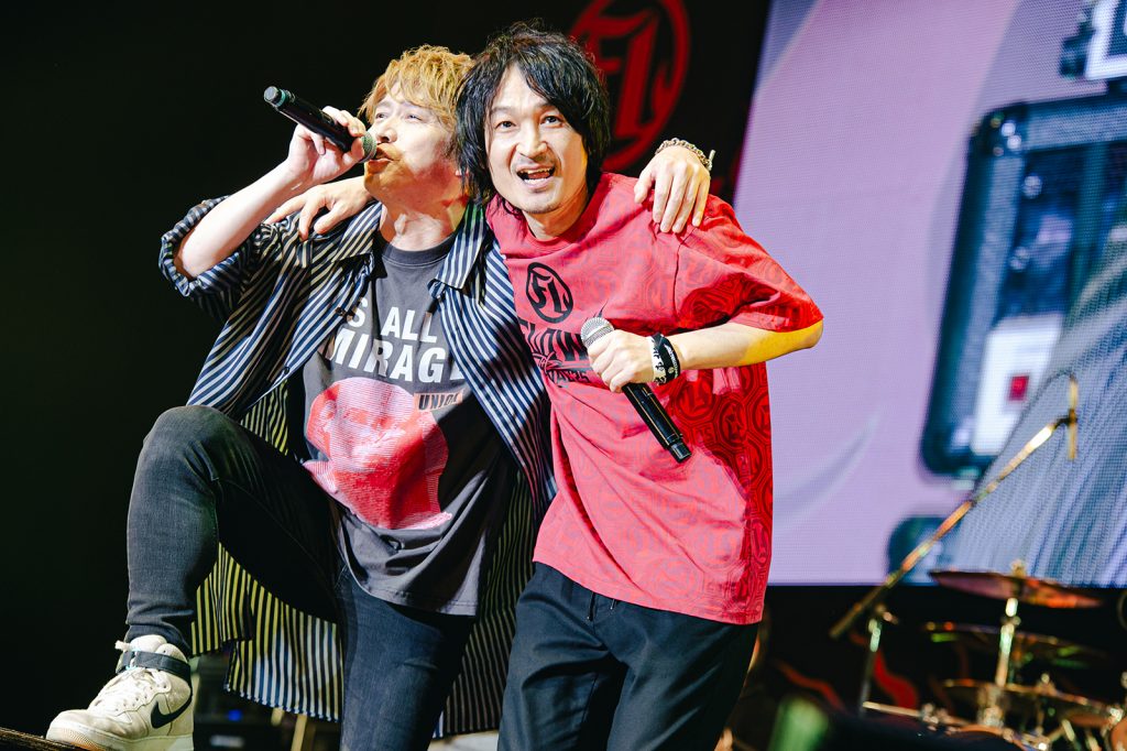 「どうも、スキマスイッチです!」と大橋卓弥が軽やかに声をあげ、ドラムの音が響いて「ユリーカ」からステージは始まった。常田真太郎のピアノが歌うように音を紡ぐ爽やかなナンバーはTVアニメ『宇宙兄弟』のOPテーマだ。フロアから歌声が沸き、体を揺らして音楽を堪能する観客たちは常田が静かに音を鳴らした瞬間、「おお!」と声をあげた。それは映画『ドラえもん のび太の恐竜2006』主題歌「ボクノート」。その瞬間まで、フロアは赤いペンライトの光が揺れていたが、それらは青一色に変わる。ドラえもんを思わせる青の光の中で歌いあげられる優しいメロディに、青い光は風がそよぐように揺れていた。続けて常田がピアノをつま弾くと今度は「おお…」とどよめきの声が。響きだしたのは「奏(かなで)」だ。2006年の誕生以降、何度となく主題歌にCMソング、テーマソングにカバーにと起用された名曲。TVアニメ『一週間フレンズ。』やTVアニメ『からかい上手の高木さん2』でもカバーされたナンバーを、一瞬も逃すまいと観客は聴き入っていた。そんな景色を見渡すスキマスイッチの2人は、ペンライトの色が一斉に変わることに驚きを隠せないでいた。ドラムがリズムを刻み、そこにギターが乗ると「おお!」と今度は歓声が沸く。TVアニメ『ハイキュー!!』のOPテーマの躍動感ある爽快なロックナンバー「Ah Yeah!!」にフロアはオレンジと赤に染まり、オーディエンスの影が跳ね、情感たっぷりに駆けるピアノの旋律から始まる「全力少年」では大合唱が生まれた。最後はTVアニメ『鋼の錬金術師 FULLMETAL ALCHEMIST』のOPテーマ「ゴールデンタイムラバー」。アニメ映像が楽曲をより熱く感じさせた。FLOWの同期アーティストはこうしてフェスを盛り上げたのだった。