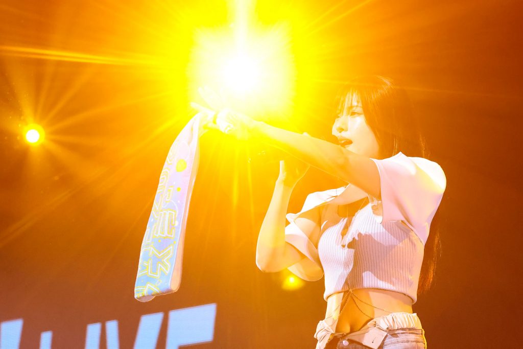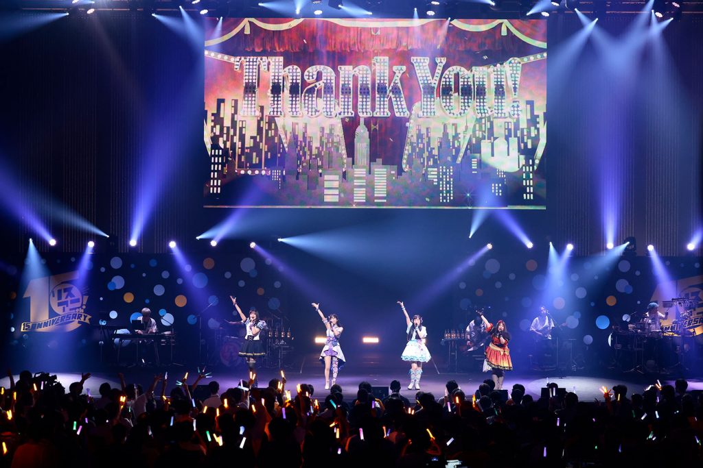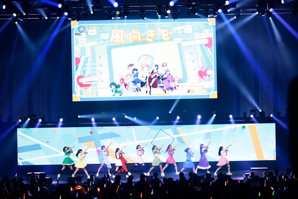 まずは“リスアニ!LIVE”史上初のオープニングアクトとして、今年5月にスタートしたコンテンツ『イキヅライブ! LOVELIVE! BLUEBIRD』より、10人組のスクールアイドルグループ・いきづらい部!が前日に続き登場。綾咲穂音(高橋ポルカ役)、遠藤璃菜(麻布麻衣役)、宮野 芹(五桐 玲役)、藤野こころ(駒形花火役)、坂野愛羽(金澤奇跡役)、瀬古梨愛(調布のりこ役)、奥村優季(春宮ゆくり役)、天沢朱音(此花輝夜役)、小戸森穂花(山田真緑役)、涼ノ瀬葵音(佐々木翔音役)が各々のメンバーカラーをあしらった衣装で届けたのは、現時点で唯一の全体曲「What is my LIFE?」。10色のライトに照らされた登場シーンも印象的で、スクリーンに映されたリリックビデオを背にしながら、新しいアイドルライフの始まりへの期待を躍動感たっぷりに歌う。そしてDAY1公演と同じく、『ラブライブ!』シリーズの偉大なる先輩スクールアイドルグループ・μ’sの夏ソング「夏色えがおで 1,2,Jump!」を溌溂とパフォーマンスし、オープニングアクトとしての大任をしっかりと果たした。