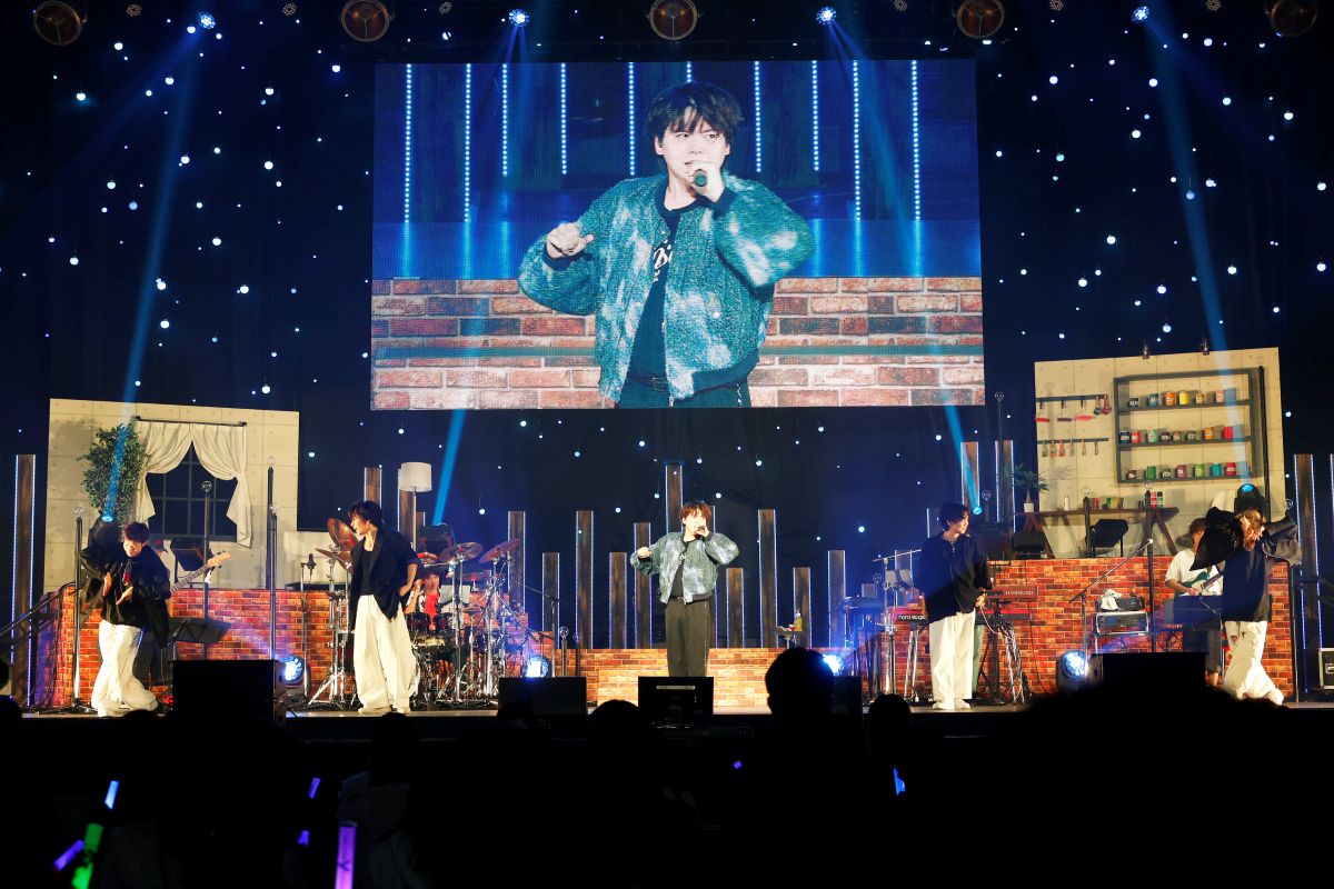 ブリッジムービーを挿み、バルーンこと須田景凪と初めてタッグを組んだ「ハートエイク」のアニメーションMVを背にしながら、その世界観に入り込むように感情たっぷりに熱唱すると、続いてはスムーズな美声が心地良い「ERROR」へ。声優という職業柄もあってか、楽曲ごとに色を変える歌唱表現の引き出しの多さに圧倒される。そしてTVアニメ『あひるの空』エンディング主題歌にして、彼のライブにおける鉄板曲に育っている「Over」。マイクスタンドをステージ脇に思い切り蹴飛ばすパフォーマンスやコール&レスポンスで、会場のボルテージをさらに引き上げていく。