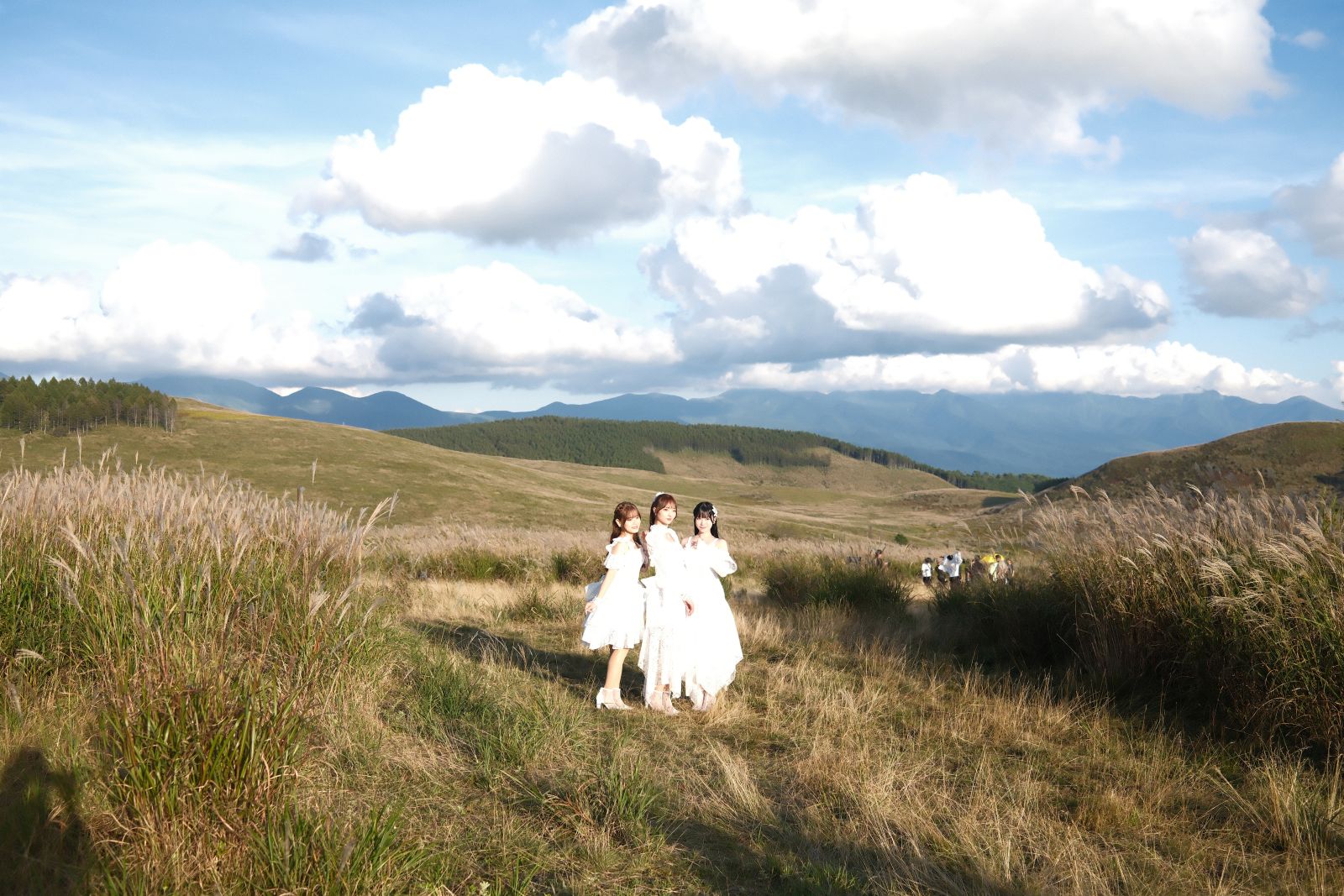 午前中にClariSのメンバーが到着すると、早速撮影に向けての準備が開始され、まずは個々のメンバーによるソロカットからの収録となる。子供の背丈をゆうに超えるススキがうっそうと茂った草原をかき分けるようにして撮影場所に進んでいくと、すでに収録スタッフが撮影の準備を整えている。