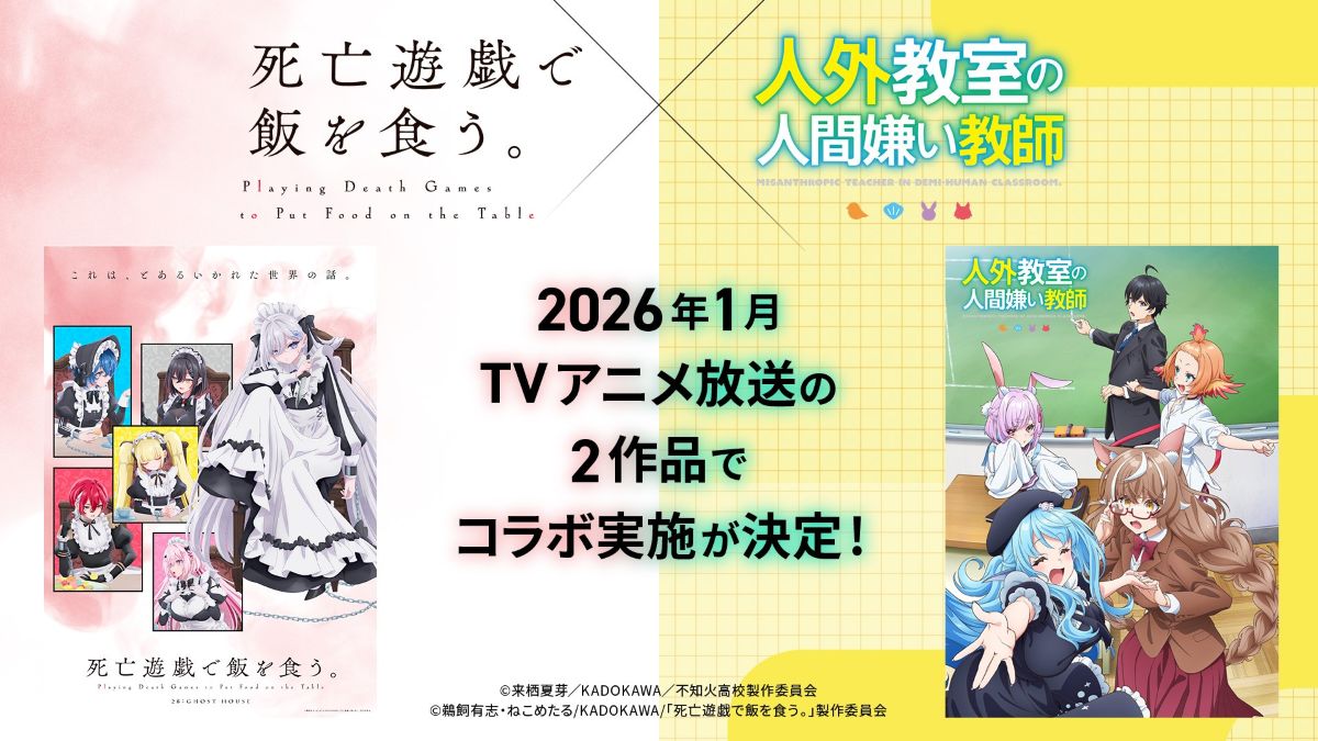 さらに、TVアニメ『人外教室の人間嫌い教師』と、同じく2026年1月より放送開始となるTVアニメ『死亡遊戯で飯を食う。』とが、放送期間中にコラボ実施することが解禁された。MF文庫J作品として、ともに冬クールを盛り上げていく本コラボにぜひ注目してほしい。