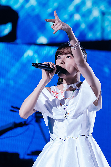 続く「My Orchestra」では煌めく映像を背負いながら、優しくもサウンドにマッチしたスケールの大きさを感じさせる歌声を大会場へと響かせ、美しくも壮大な雰囲気を作り上げていく。大サビでは曲の盛り上がりに沿って歌声にもう一段力を込め、内に湧き上がる感情を発露して観客の心を惹き付けたところで水瀬は降壇。ブリッジムービーとしてここまでの歴史を振り返るかのような映像が上映される。