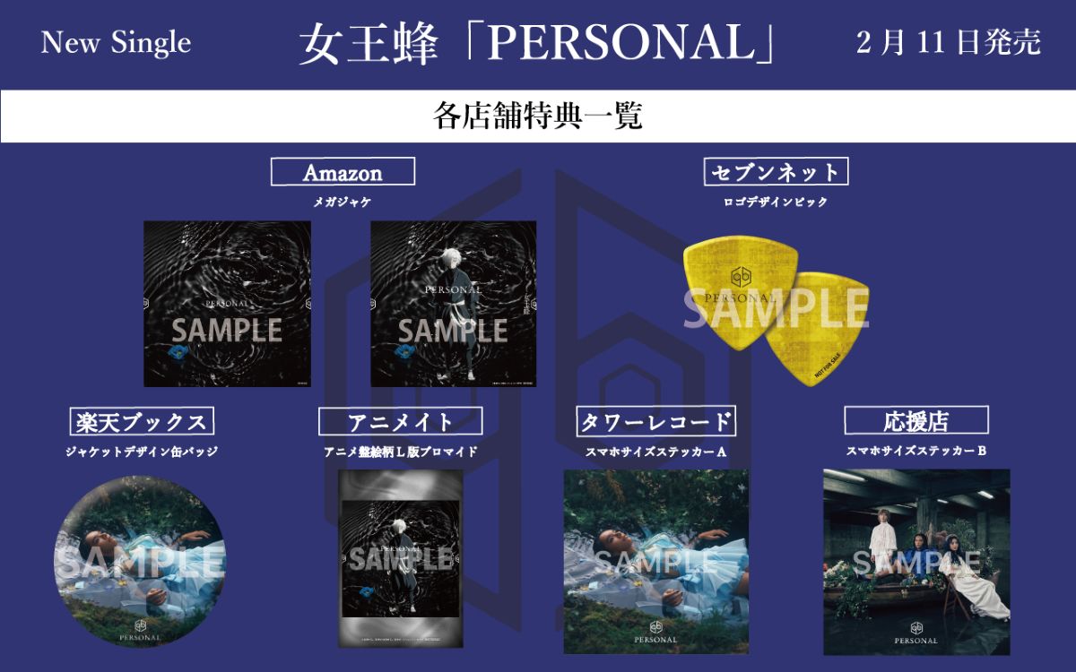 New Single「PERSONAL」のCDは、2月11日発売予定となっており、各CDショップの特典絵柄も解禁され、各CDショップにて予約を受付中。完全生産限定盤は、“女王蜂 単独公演「強火」[2025.07.23 Live at 東京ガーデンシアター]”の選りすぐりのライヴ映像を収録したBlu-rayに、7inchレコードサイズのビジュアルカード(全24種)を付属。7inchレコードサイズの豪華特製BOX仕様となっている。期間生産限定盤は、7inchレコードサイズのアニメ描き下ろし絵柄紙ジャケット仕様で、2形態での発売となる。どちらにも、カップリング曲として新曲「HELTZ」が収録される。